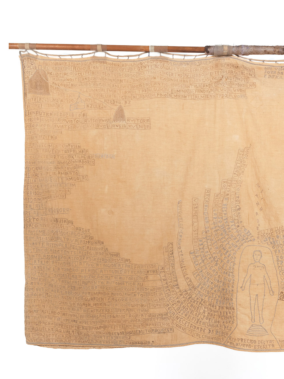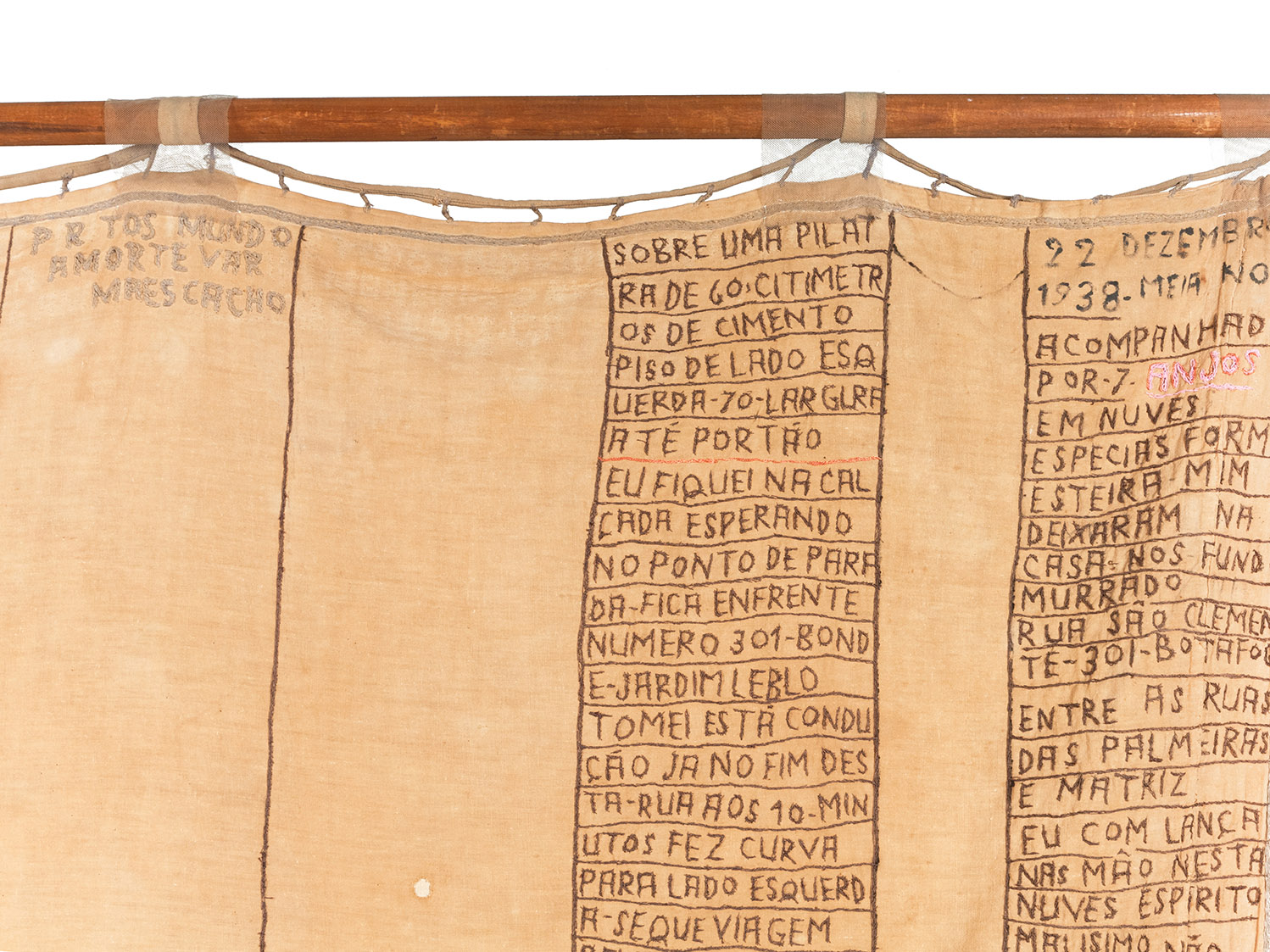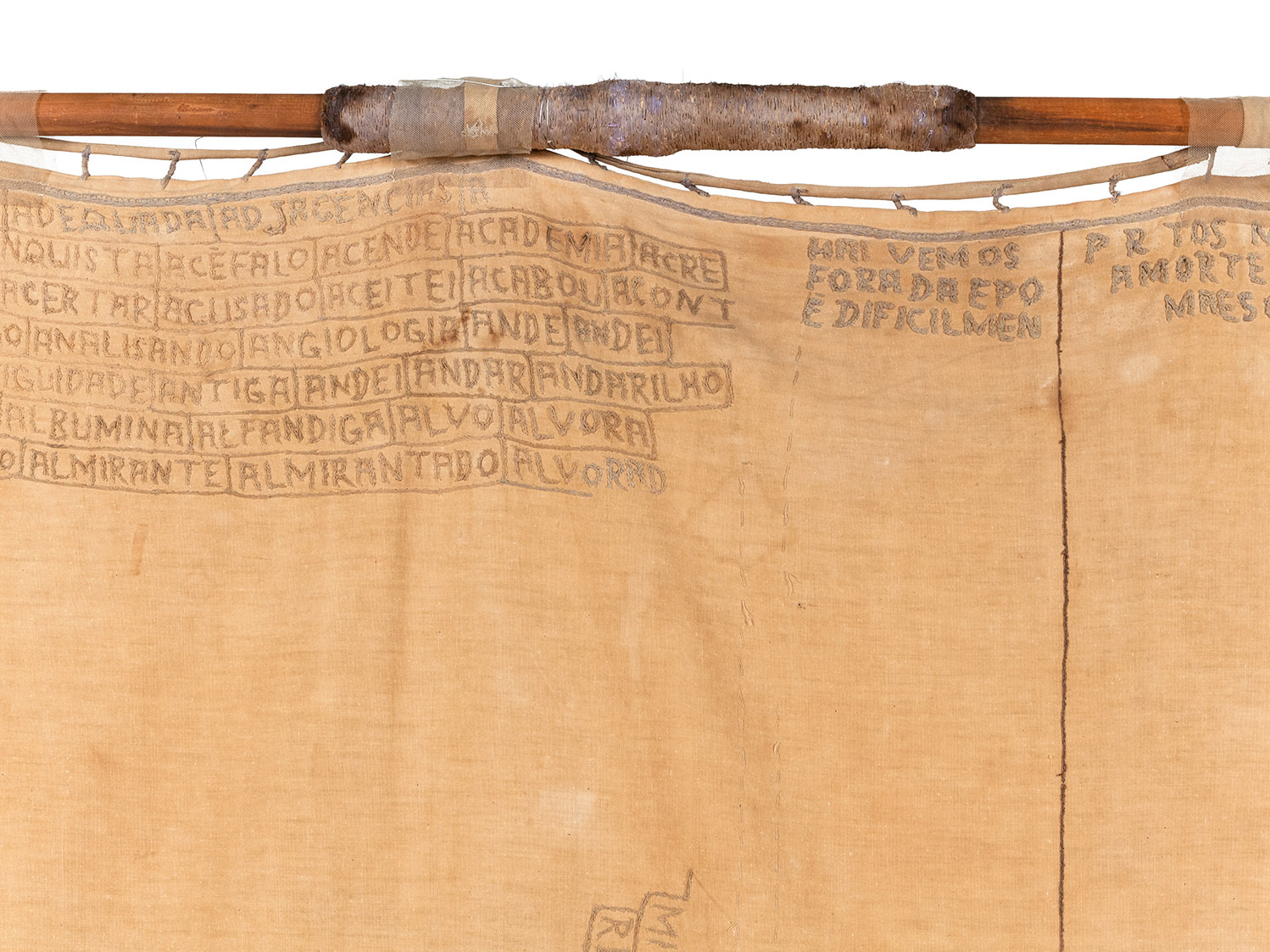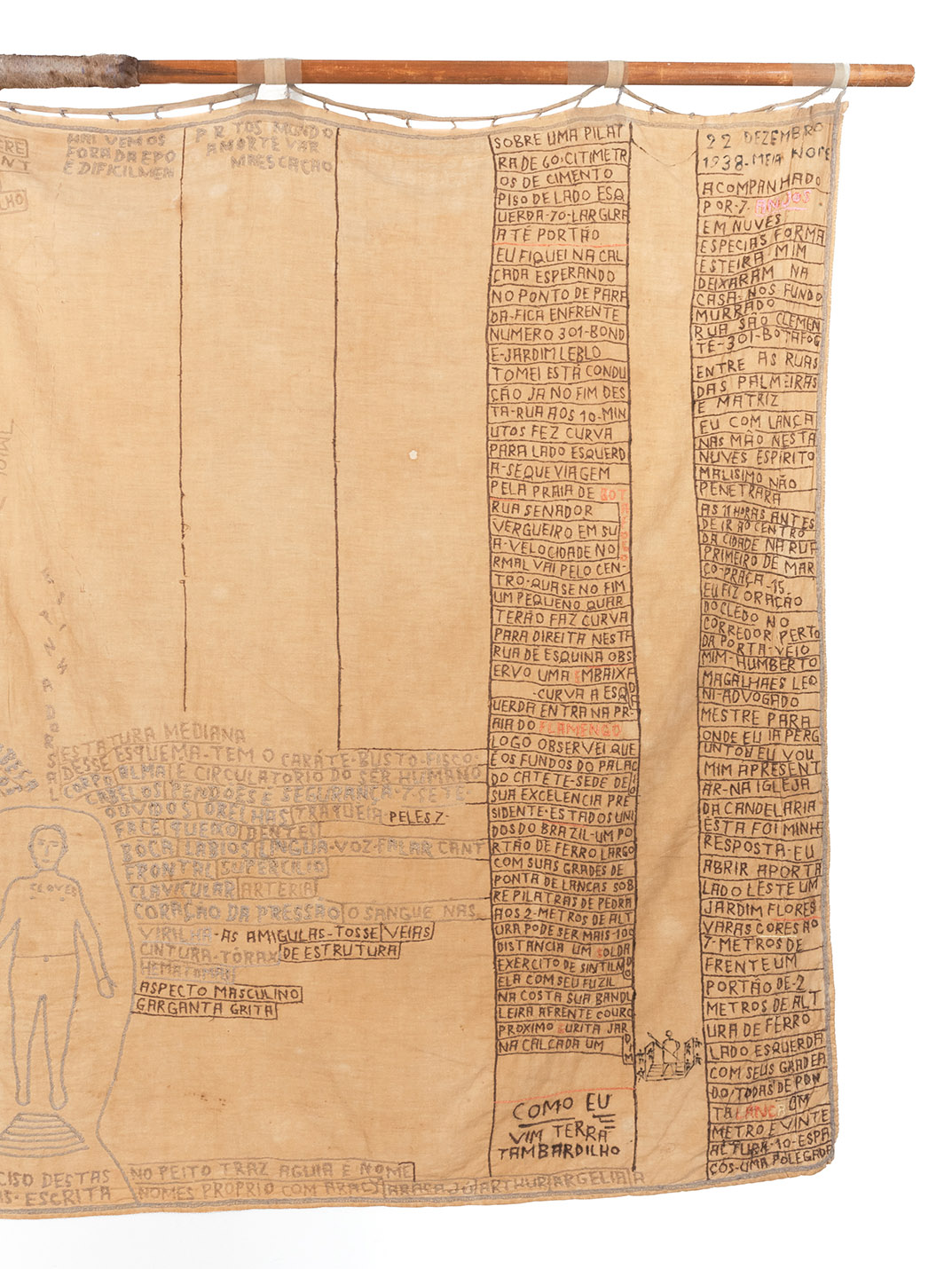 Estandarte constituído por diversos pedaços de lençóis de algodão branco envelhecido, costurados e bordados em toda superfície, com haste de sustentação em madeira revestida no centro por tecido bordado em “ORFA”. Na parte superior, arremate composto por um soutache costurado no estandarte e preso por sete pequenas tiras de couro sintético e três de cordas. Madeira do suporte de seção redonda, com 4 cm de espessura e 208 cm de comprimento. Medidas com o suporte: 126 x 208 cm. Medida do tecido: 120 x 190 cm. Na parte da frente do estandarte, representação de um clovis, Pão de Açúcar com Morro da Urca e bondinho, conjunto de palavras iniciadas com a letra A, conjunto de palavras descrevendo o corpo humano e relato dos fatos ocorridos em 22 de dezembro de 1938. No verso, sequência de palácios, mapa do Brasil com seus Estados, diversas representações de figuras geométricas e representação de uma área rural.