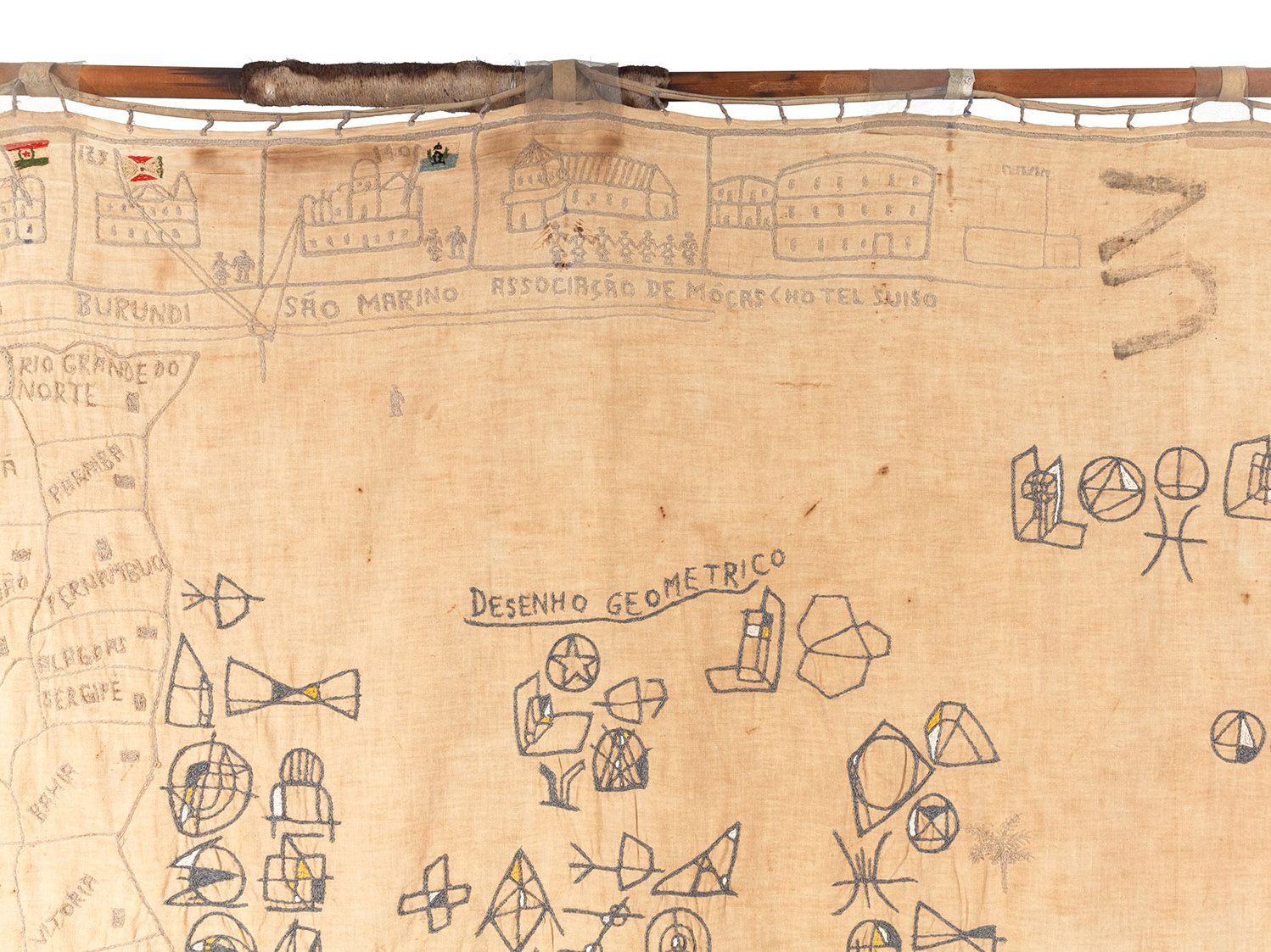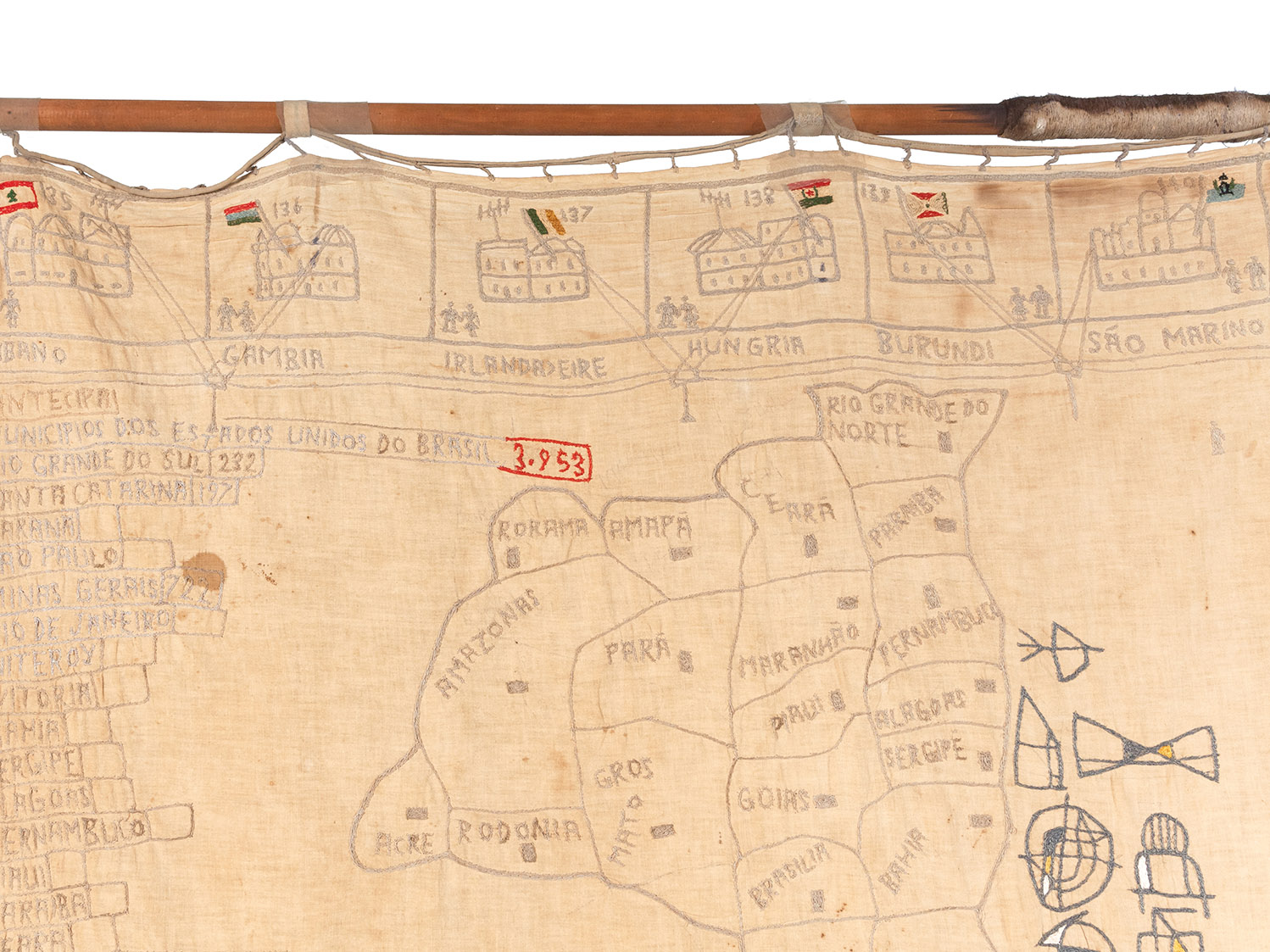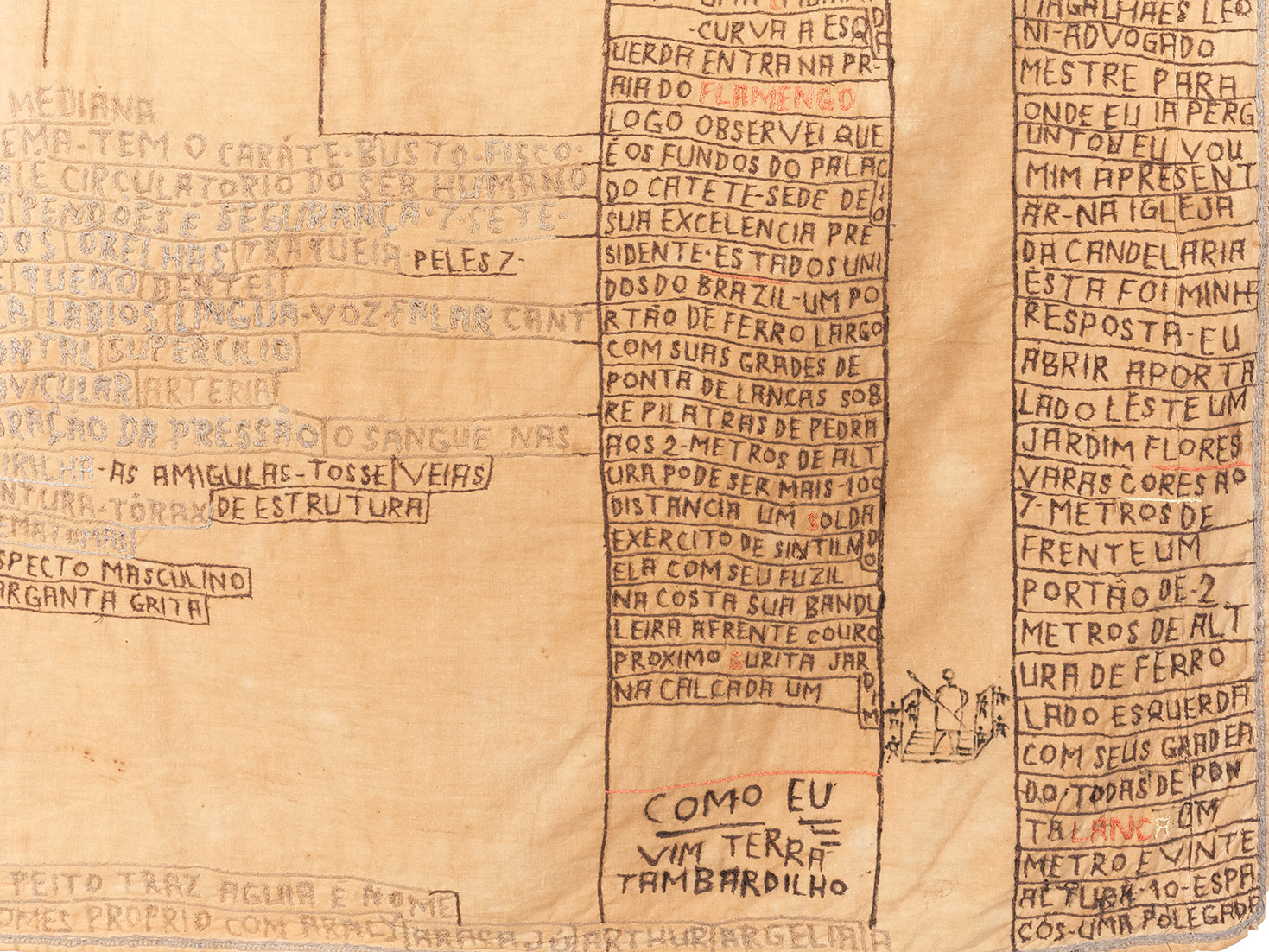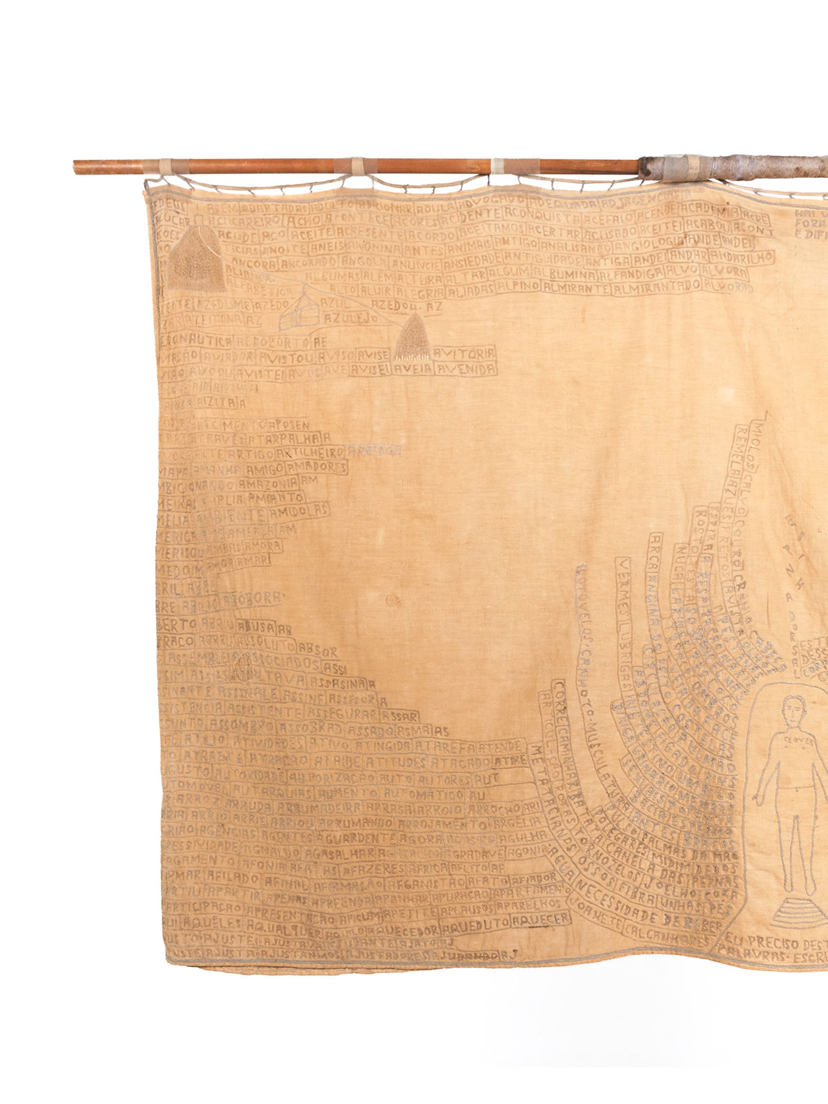 Estandarte constituído por diversos pedaços de lençóis de algodão branco envelhecido, costurados e bordados em toda superfície, com haste de sustentação em madeira revestida no centro por tecido bordado em “ORFA”. Na parte superior, arremate composto por um soutache costurado no estandarte e preso por sete pequenas tiras de couro sintético e três de cordas. Madeira do suporte de seção redonda, com 4 cm de espessura e 208 cm de comprimento. Medidas com o suporte: 126 x 208 cm. Medida do tecido: 120 x 190 cm. Na parte da frente do estandarte, representação de um clovis, Pão de Açúcar com Morro da Urca e bondinho, conjunto de palavras iniciadas com a letra A, conjunto de palavras descrevendo o corpo humano e relato dos fatos ocorridos em 22 de dezembro de 1938. No verso, sequência de palácios, mapa do Brasil com seus Estados, diversas representações de figuras geométricas e representação de uma área rural.