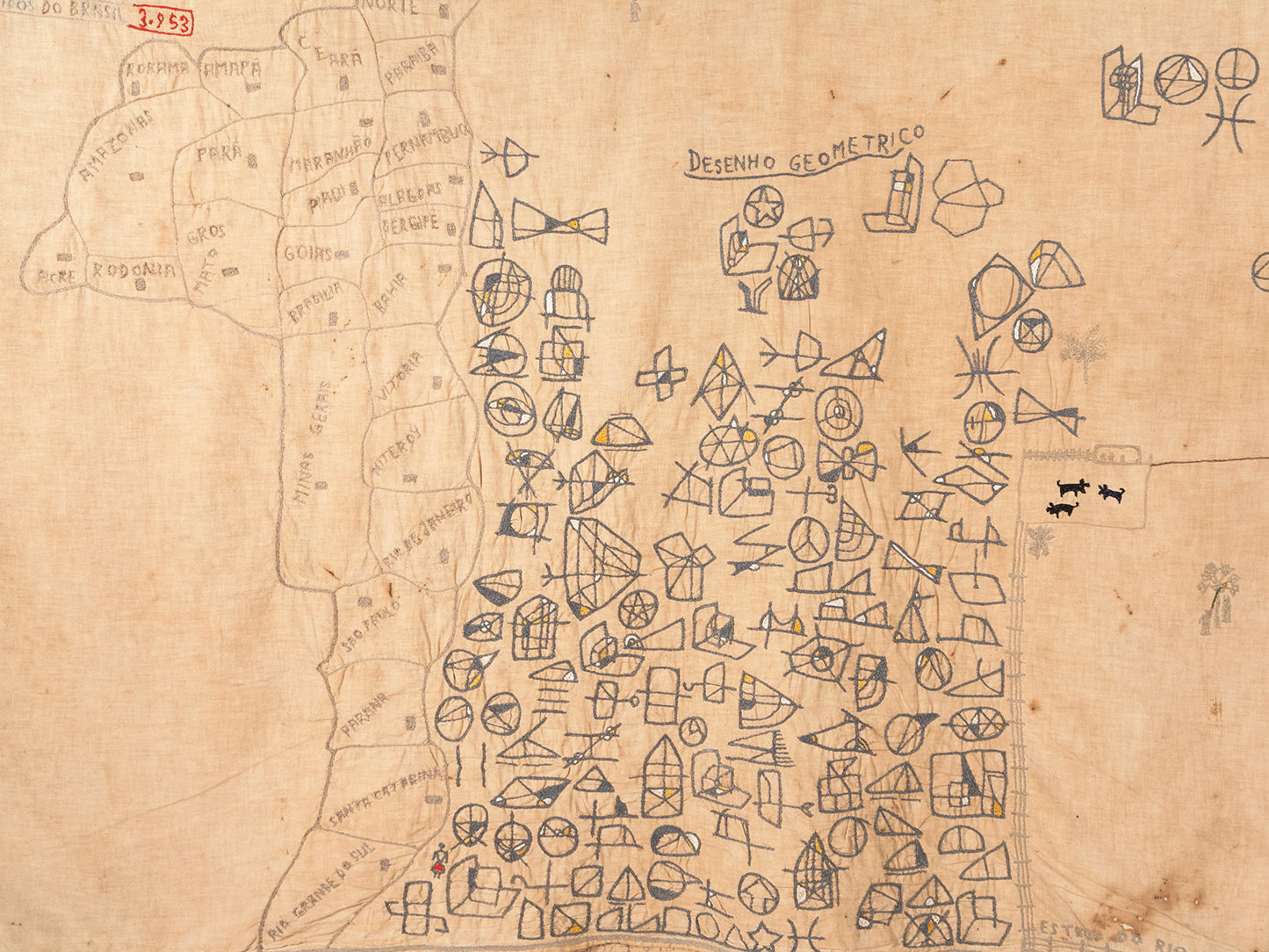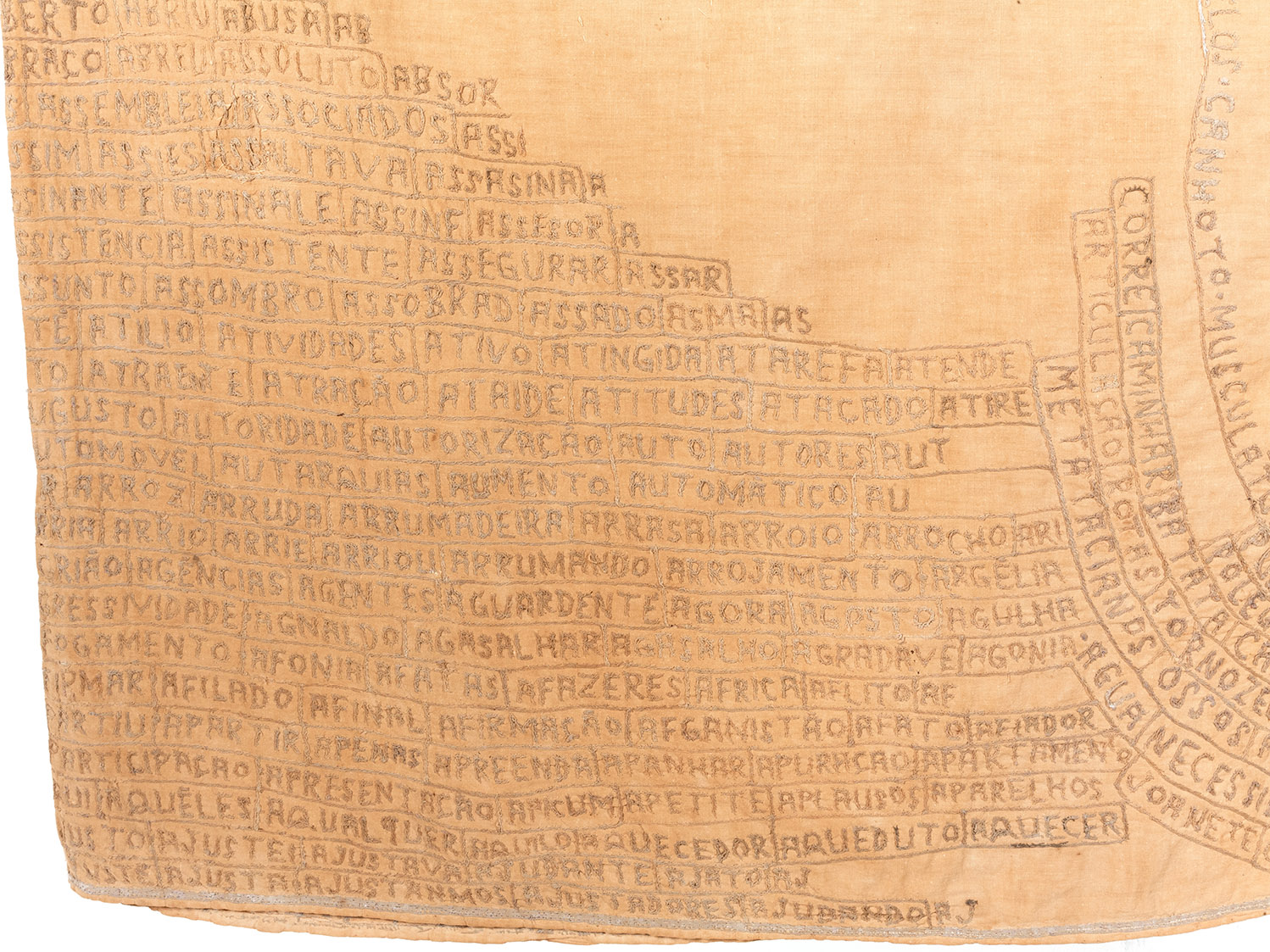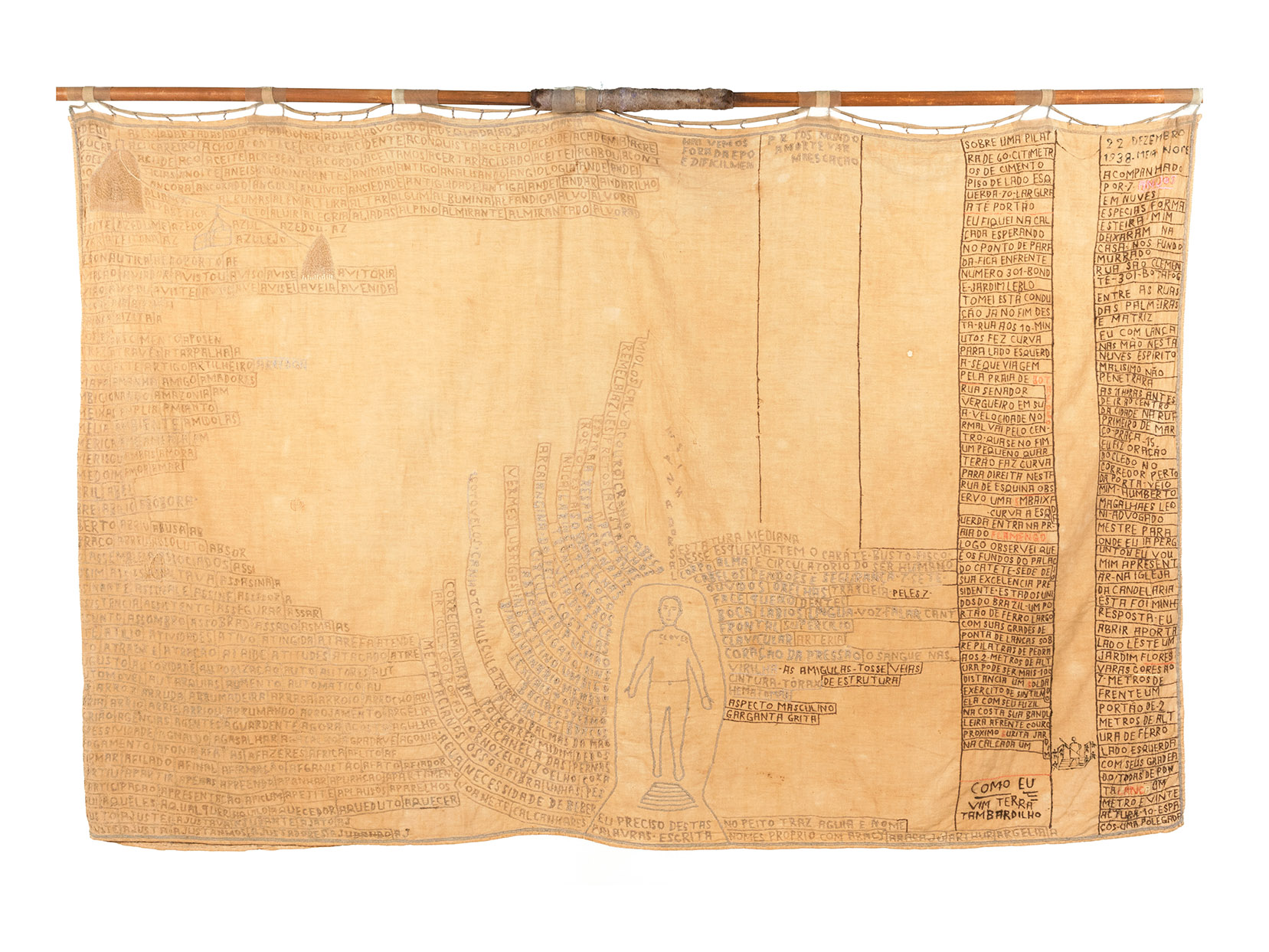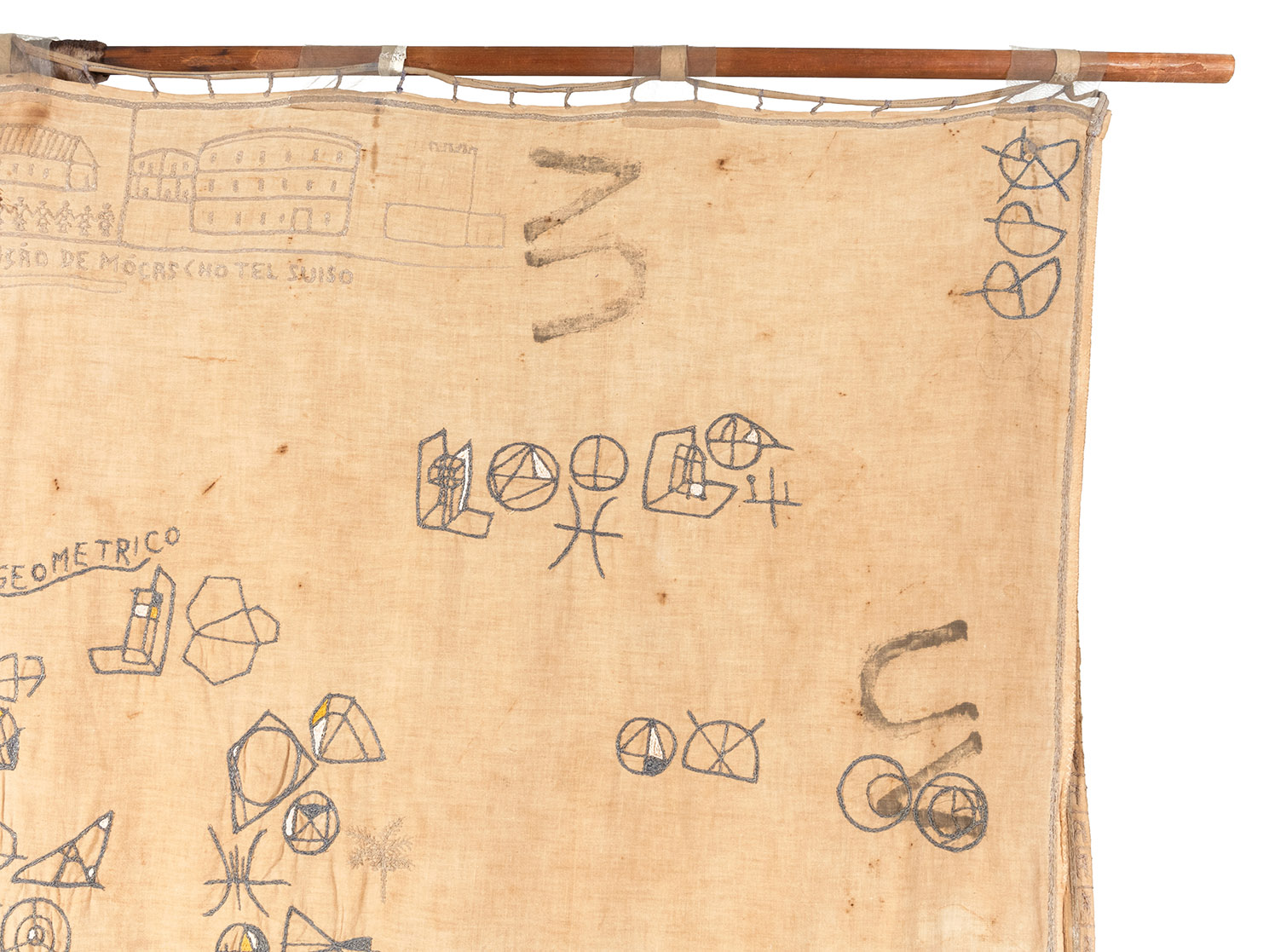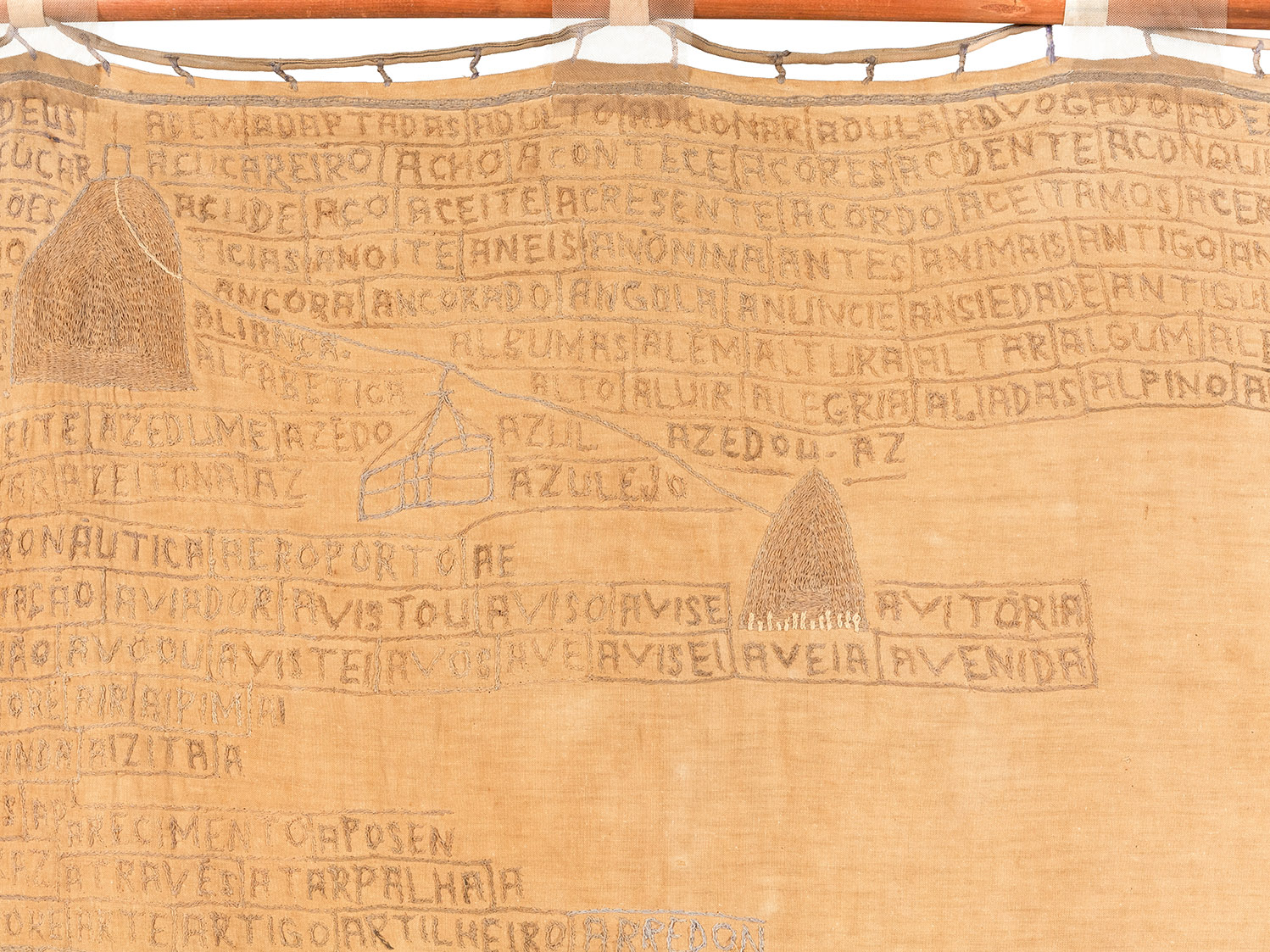 Estandarte constituído por diversos pedaços de lençóis de algodão branco envelhecido, costurados e bordados em toda superfície, com haste de sustentação em madeira revestida no centro por tecido bordado em “ORFA”. Na parte superior, arremate composto por um soutache costurado no estandarte e preso por sete pequenas tiras de couro sintético e três de cordas. Madeira do suporte de seção redonda, com 4 cm de espessura e 208 cm de comprimento. Medidas com o suporte: 126 x 208 cm. Medida do tecido: 120 x 190 cm. Na parte da frente do estandarte, representação de um clovis, Pão de Açúcar com Morro da Urca e bondinho, conjunto de palavras iniciadas com a letra A, conjunto de palavras descrevendo o corpo humano e relato dos fatos ocorridos em 22 de dezembro de 1938. No verso, sequência de palácios, mapa do Brasil com seus Estados, diversas representações de figuras geométricas e representação de uma área rural.