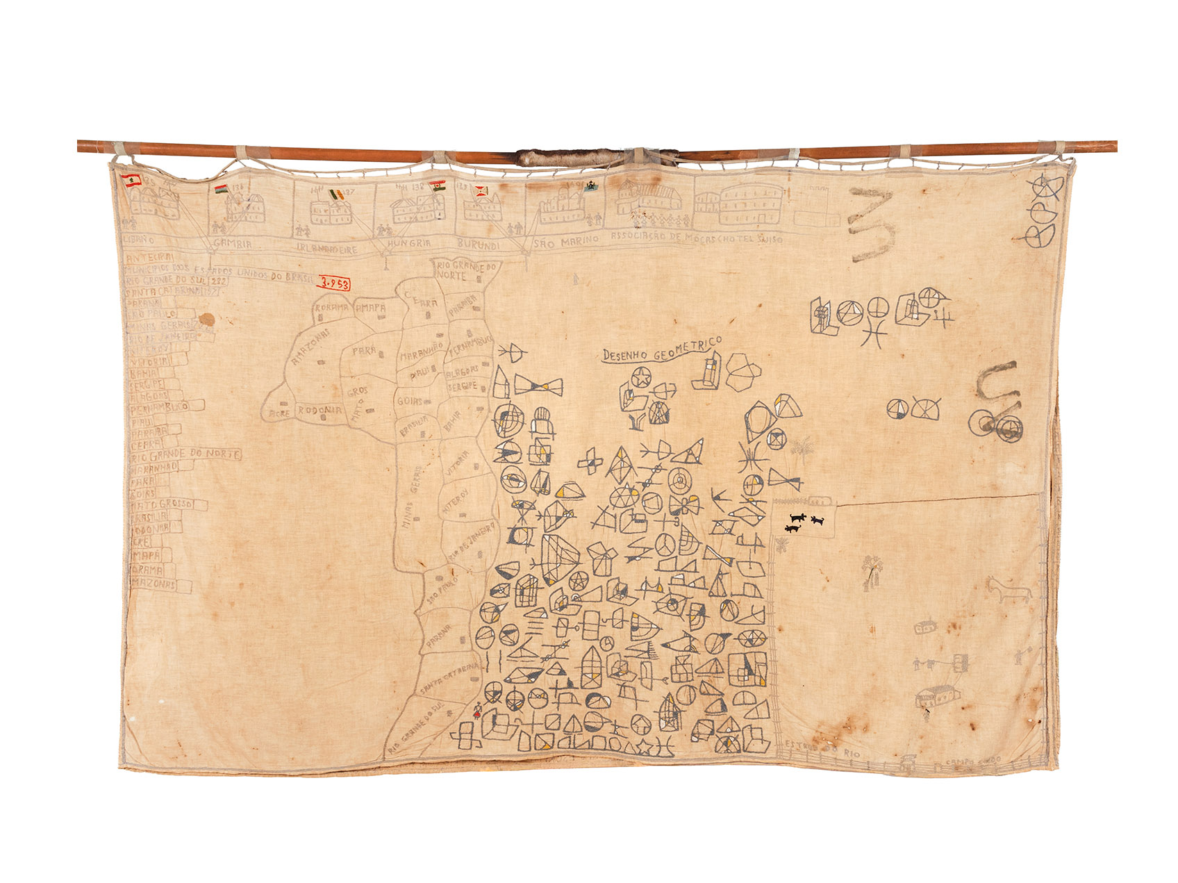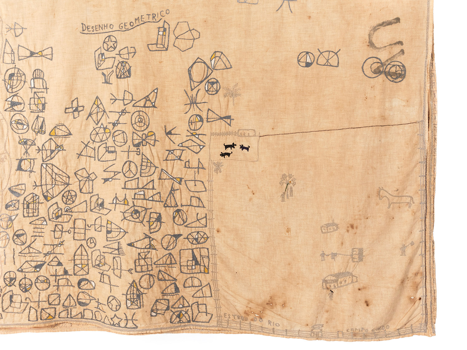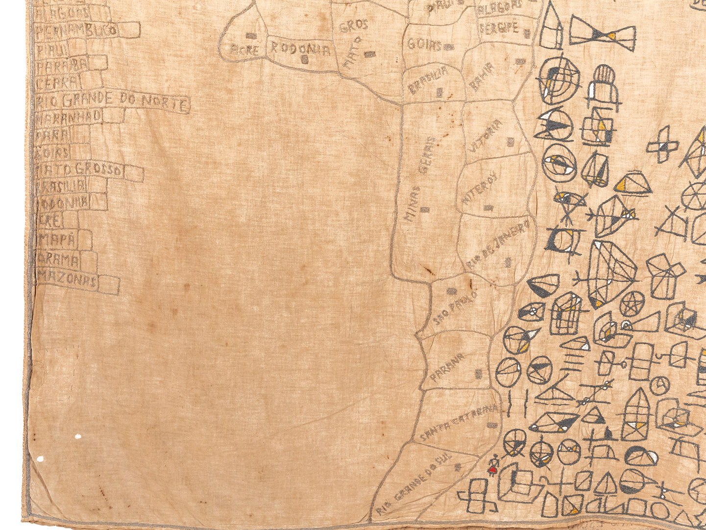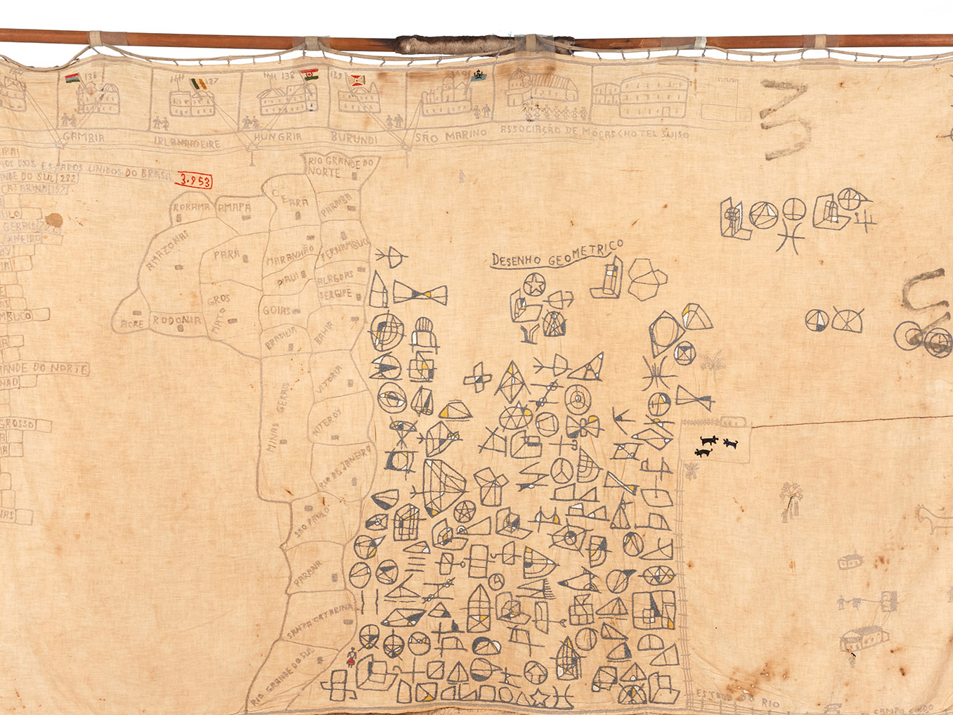 Estandarte constituído por diversos pedaços de lençóis de algodão branco envelhecido, costurados e bordados em toda superfície, com haste de sustentação em madeira revestida no centro por tecido bordado em “ORFA”. Na parte superior, arremate composto por um soutache costurado no estandarte e preso por sete pequenas tiras de couro sintético e três de cordas. Madeira do suporte de seção redonda, com 4 cm de espessura e 208 cm de comprimento. Medidas com o suporte: 126 x 208 cm. Medida do tecido: 120 x 190 cm. Na parte da frente do estandarte, representação de um clovis, Pão de Açúcar com Morro da Urca e bondinho, conjunto de palavras iniciadas com a letra A, conjunto de palavras descrevendo o corpo humano e relato dos fatos ocorridos em 22 de dezembro de 1938. No verso, sequência de palácios, mapa do Brasil com seus Estados, diversas representações de figuras geométricas e representação de uma área rural.