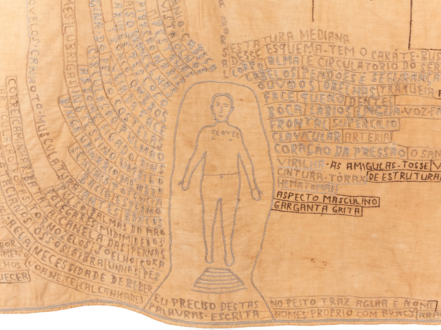 [texto bordado abaixo no entorno da campânula à esquerda] MIOLOS CALVO COURO CRÂNIO ∙ CABEÇA REMELA AZUES PRETOS AVISTA OLHOS PESTANAS ESPIRA A RESPIRAÇÃO NARIZ ROSTO TESTA SOBRANCELHAS NUCA LARINGE PESCOÇO TRONCO OMBROS VEIA DA FACE ARCA ANGINA ∙ DO PEITO COSTELAS CIRCULAÇÃO PULMÃO ABDOME FIGADO RINS VERMES LUBRIGAS INSTESTINO UMBIGO BIXIGA URINARIO MEMBRO SEXUAIS POTENCIA BACIA ESPERMO COTOVELOS . CANHOTO ∙ MUSCULATURA ANTES BRAÇOS PULSO PALMAS DA MAO POLEGARES MIDIM DEDOS CORRE CAMINHAR BATATA CANELA DAS PERNAS ARTICULAÇÃO ROTAS TORNOZELOS JOELHO COXA METATACIANOS OSSOS FIBRA UNHAS PÉS AGUA NECESSIDADE DE BEBER JOANETE CALCANHARES