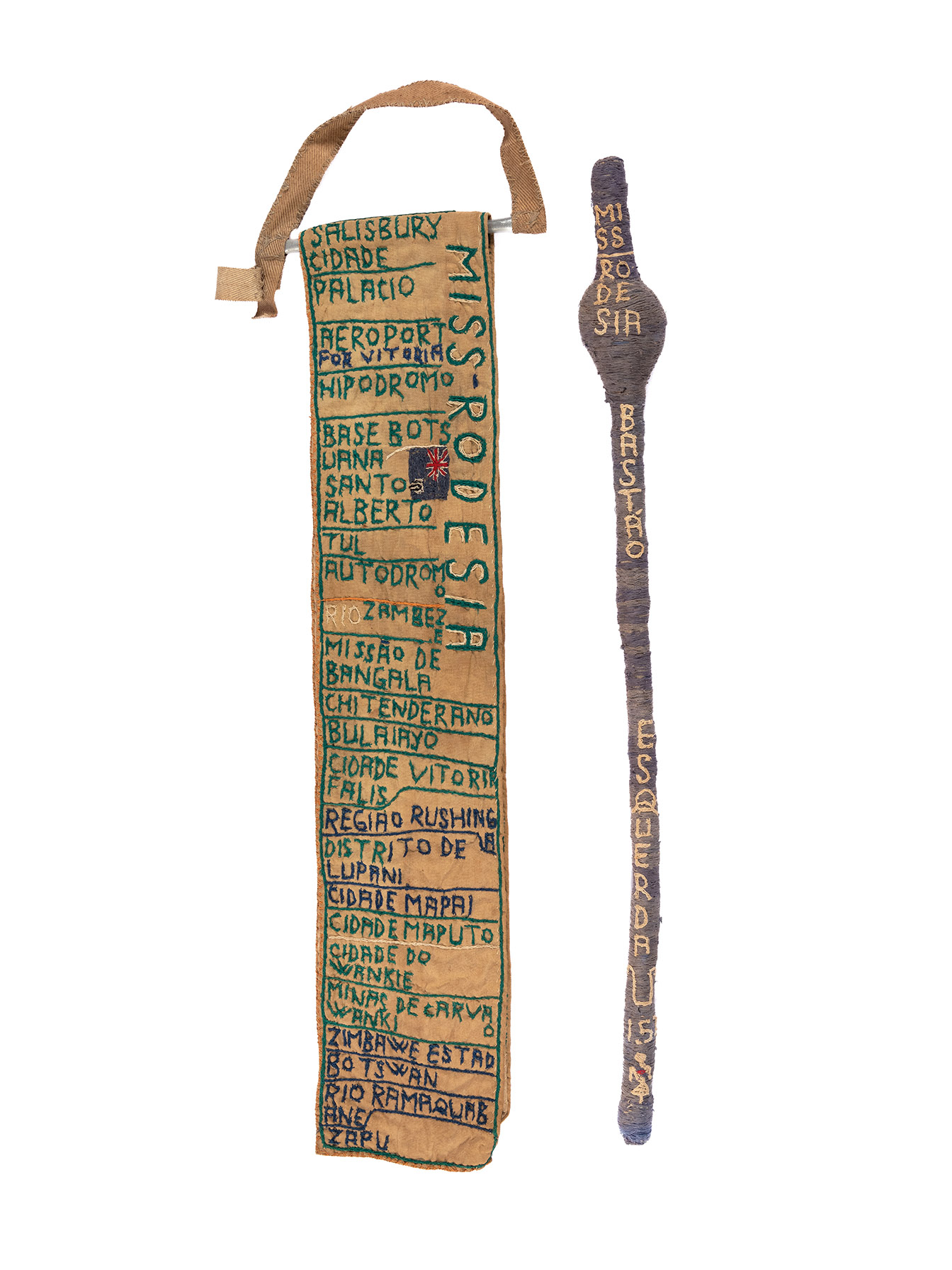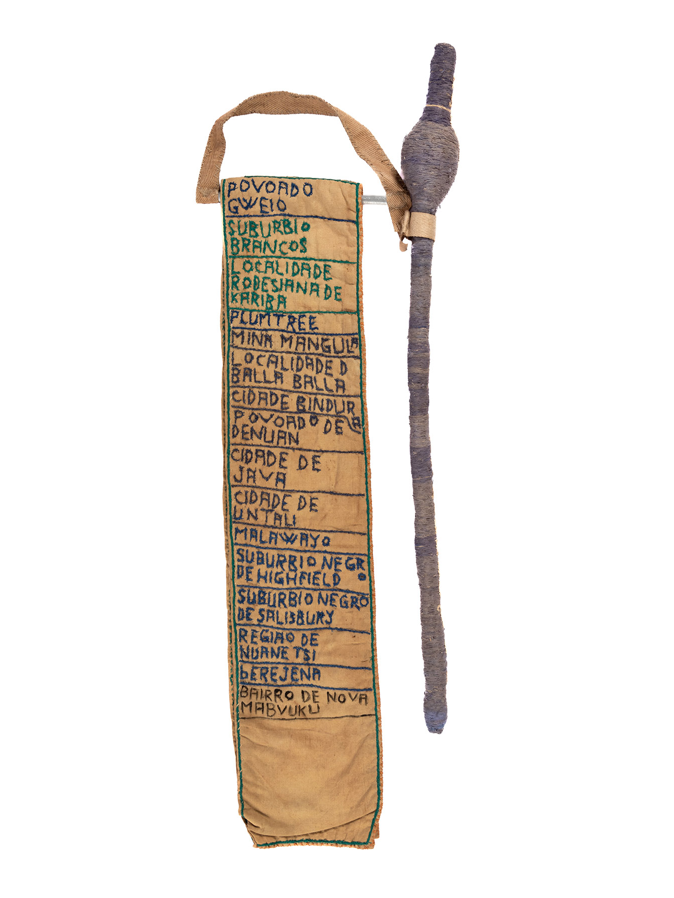 [Verso da faixa na lateral esquerda com inscrição horizontal bordada] POVOADO GWEIO | SUBURBIO BRANCOS | LOCALIDADE RODESIANA DE KARIBA | PLUMTREE | MINA MANGULA | LOCALIDADE D BALLA BALLA | CIDADE BINDURA | POVOADO DE DENUAN | CIDADE DE JAVA | CIDADE DE UNTALI | MALAWAYO | SUBURBIO NEGRo DE HIGHFIELD | SUBURBIO NEGRO DE SALISBURY | REGIAO DE NUANE TSI | bEREJENA | [em tinta] BAIRRO DE NOVA MABVUKU |