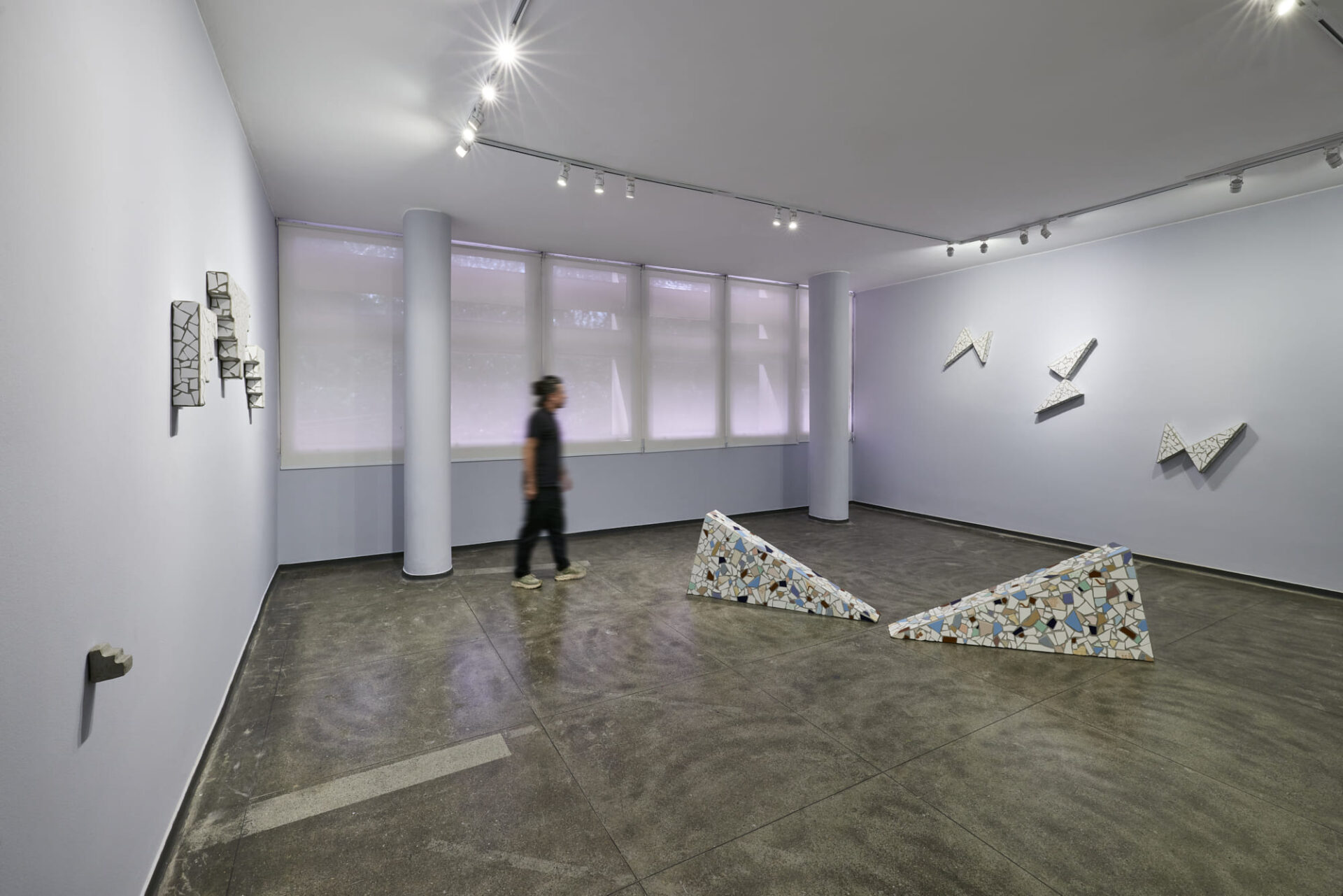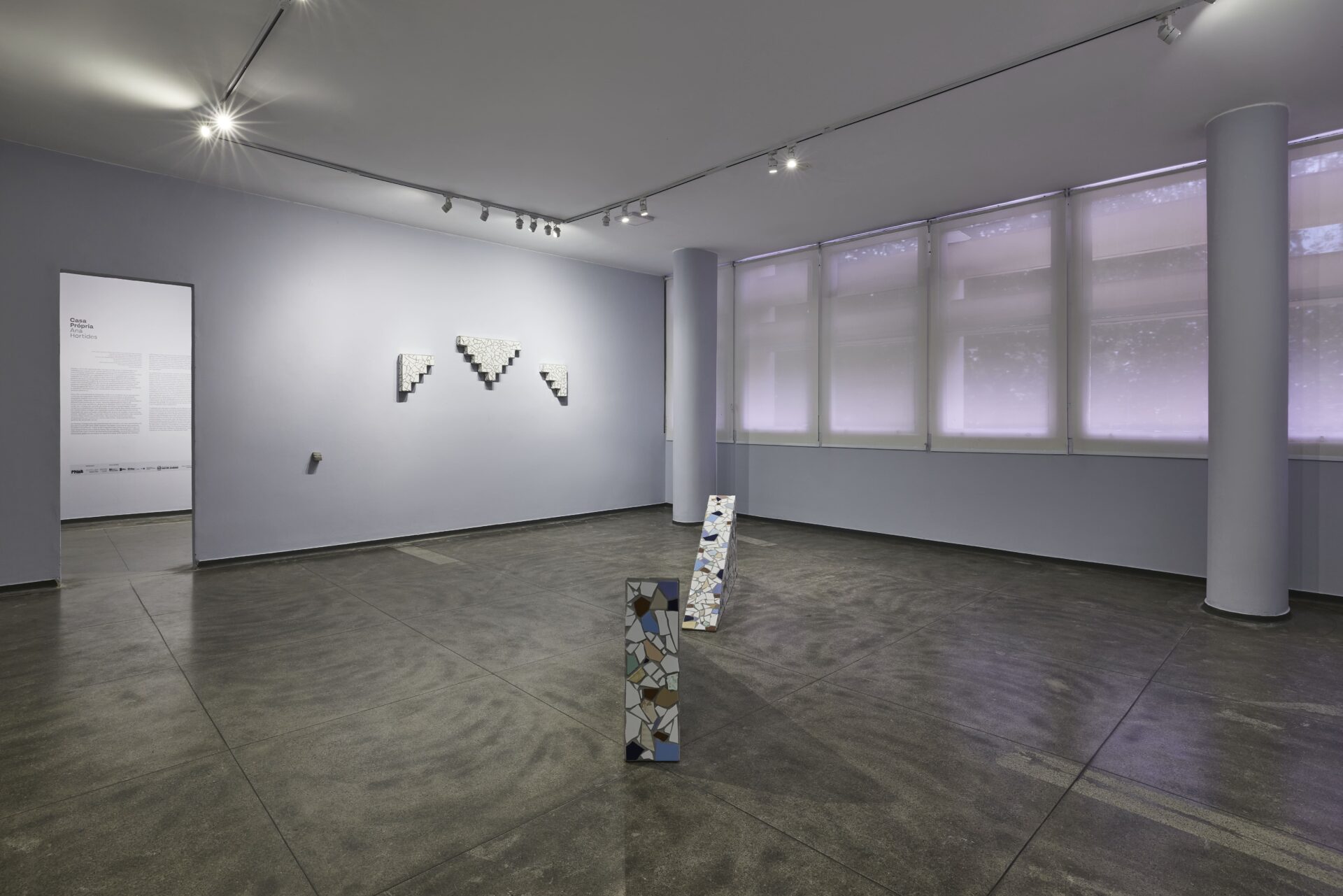 obras das séries Casa 15 (2020-2026), Platibanda (2024-2026) e To and fro (2026). Em Casa Própria, Hortides investiga os padrões ornamentais que marcam as fachadas das casas populares brasileiras, especialmente o uso de cacos cerâmicos e pisos coloridos aplicados de forma manual. Essas composições, muitas vezes nomeadas pela artista como “padrão” ou “raios”, compõem um repertório visual que atravessa o cotidiano urbano e ganha densidade poética no espaço expositivo.